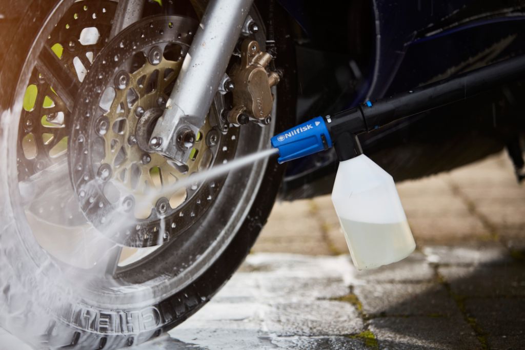 Verwandeln Sie Ihr Fahrrad oder Motorrad mit diesem Reinigungsmittel auf Wasserbasis, das Schmutz, Öl und Fett außerordentlich gründlich beseitigt. Verwenden Sie für optimale Ergebnisse den Nilfisk Schaumsprüher und Ihre Fahrräder, Mountainbikes und Motorräder werden im Handumdrehen wie neu aussehen.