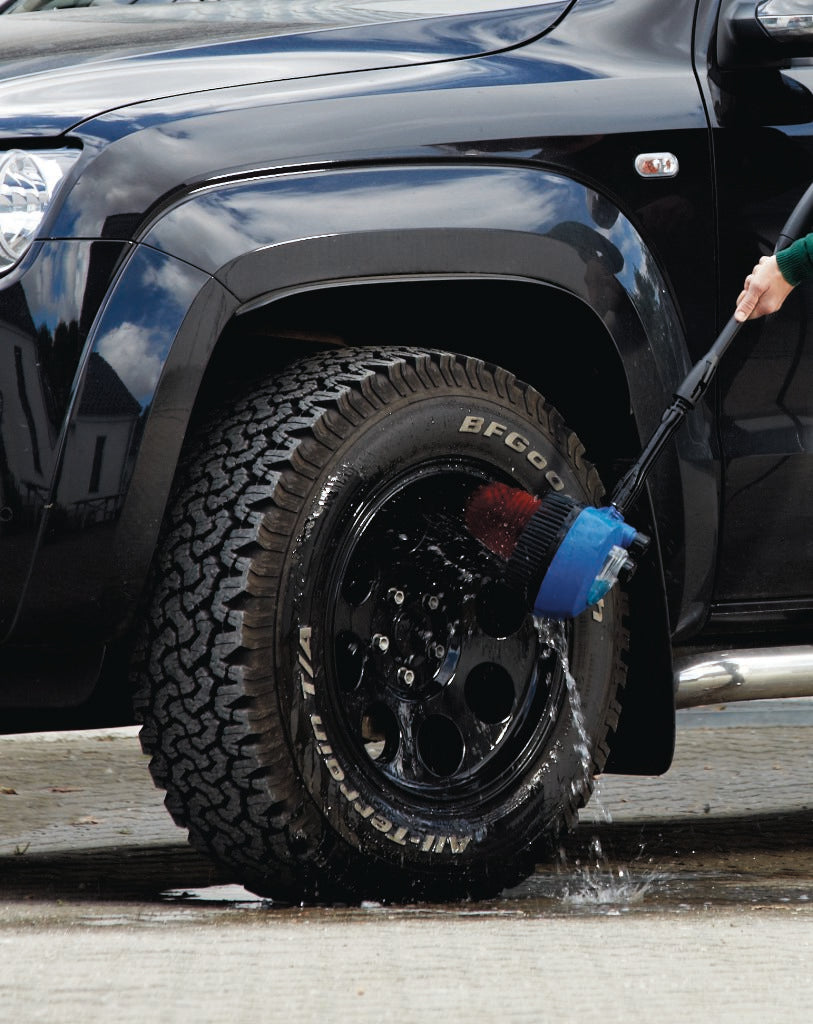 - Grâce à la rotation de la brosse pour jantes, un plus grand nombre de poils est en contact avec la surface, ce qui accélère le nettoyage